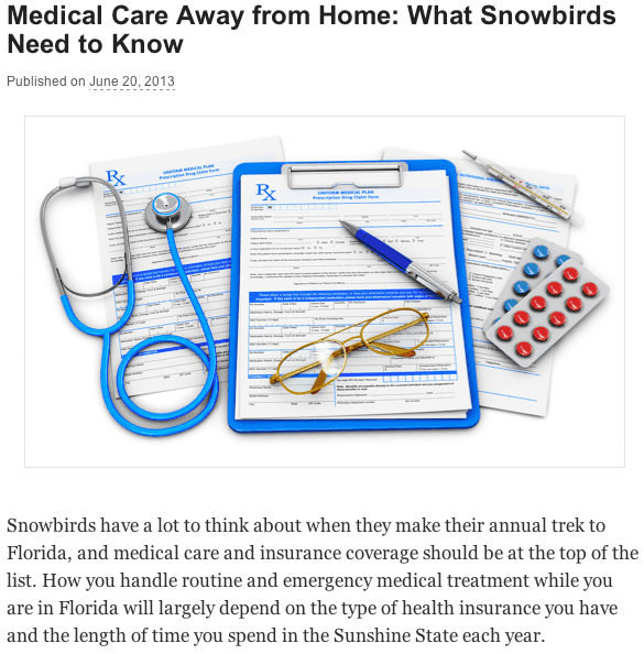 This week we've got some great tips for you about choosing a physician in Florida, how to make sure your out-of-state insurance covers you in both routine and emergency situations, and more.